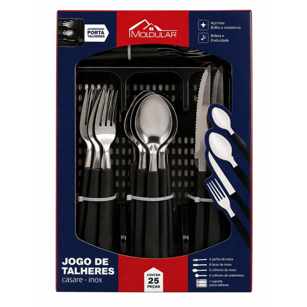 Composto por 25 peças essenciais para o dia a dia, o conjunto atende bem às necessidades de refeições completas, sendo ideal para uso doméstico. Acompanha um suporte organizador na cor preta, que facilita o armazenamento e mantém os talheres sempre à mão, além de contribuir para a organização da cozinha.