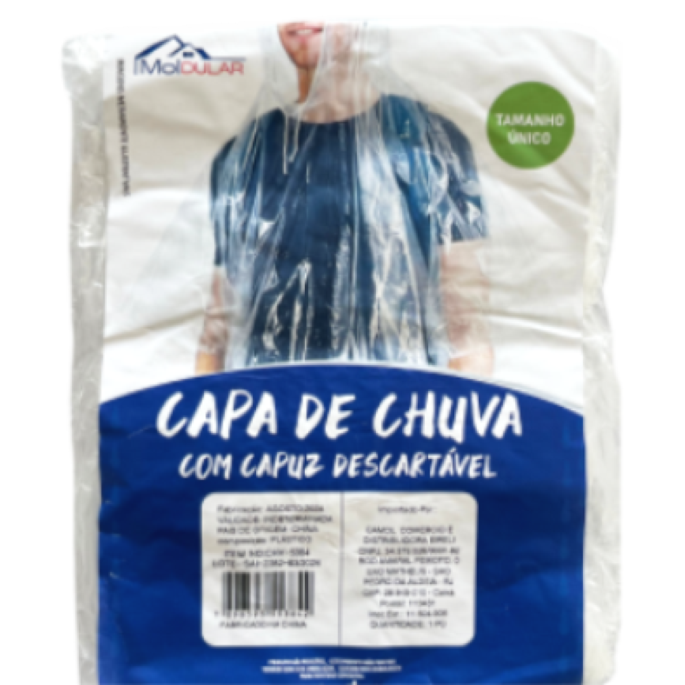 Proteção imediata contra a chuva onde quer que você esteja! A Capa de Chuva Descartável com Capuz da Moldular é a solução prática e econômica para dias chuvosos. Feita em material leve e resistente à água, é ideal para uso emergencial em eventos, viagens, passeios ou no dia a dia.