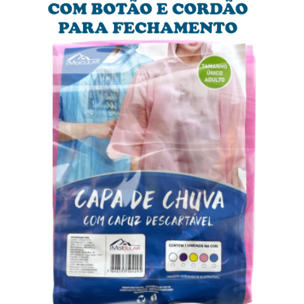 Praticidade e proteção em qualquer momento! A Capa de Chuva Adulto Descartável da Moldular é feita em PVC leve e impermeável, ideal para uso emergencial em dias de chuva. Com tamanho único adulto, se adapta facilmente a diferentes corpos, oferecendo cobertura eficiente.