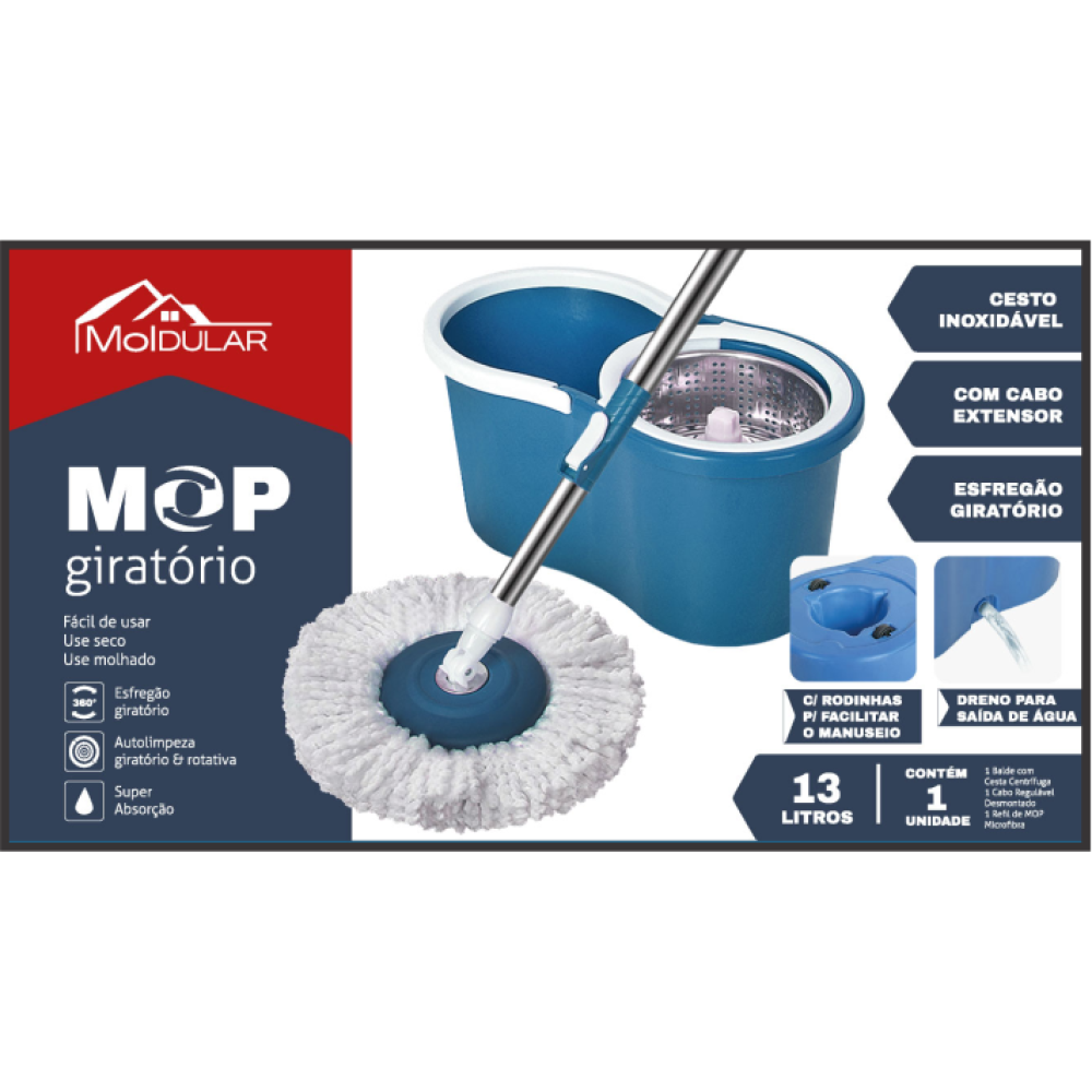 Deixe a faxina mais rápida e confortável com o Mop Giratório da Moldular! Desenvolvido para facilitar sua rotina, ele conta com um cesto em aço inoxidável resistente e durável, além de um cabo extensor ajustável, ideal para alcançar todos os cantos da casa sem esforço.