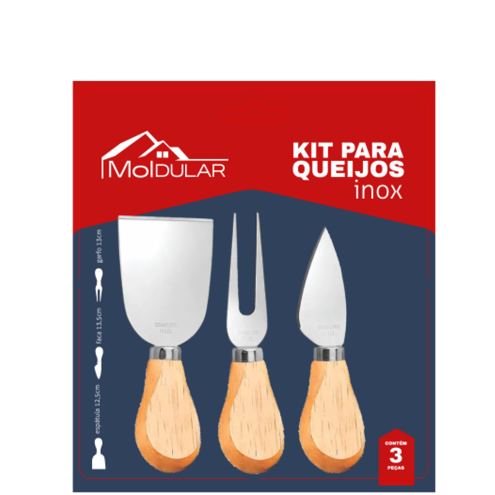 O kit para queijo com 3 peças da Moldular é ideal para quem aprecia queijos e quer oferecer uma experiência completa e sofisticada na hora de servir. Composto por 1 garfo, 1 espátula e 1 faca, ele permite cortar, fatiar e servir diferentes tipos de queijos com precisão e charme.