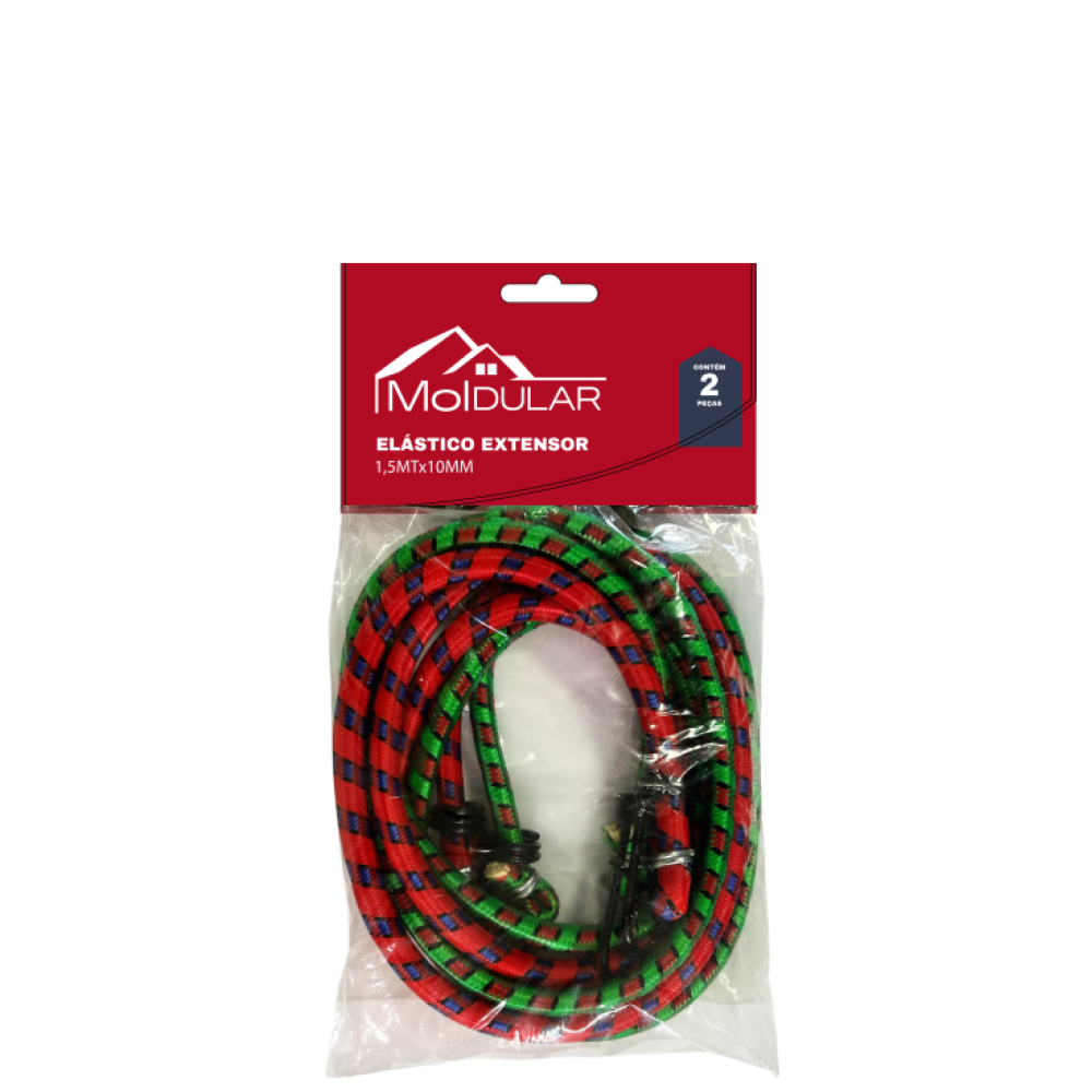 O Elástico Extensor 1,5m x 10mm da Moldular é ideal para fixação e amarração de cargas em veículos, bagageiros, bicicletas e diversas outras utilidades no dia a dia. Fabricado com material resistente e elástico de alta qualidade, proporciona firmeza e segurança no transporte de objetos. Cada embalagem contém 2 unidades, prontas para uso.