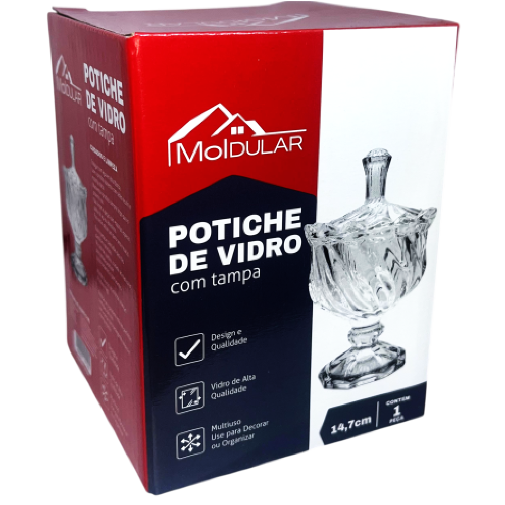 Possui pé elevado e tampa com pegador, ideal para armazenar pequenos itens como balas, bombons, bijuterias ou algodões, além de ser um charme à parte na composição de lavabos, bandejas decorativas, penteadeiras e salas de estar.