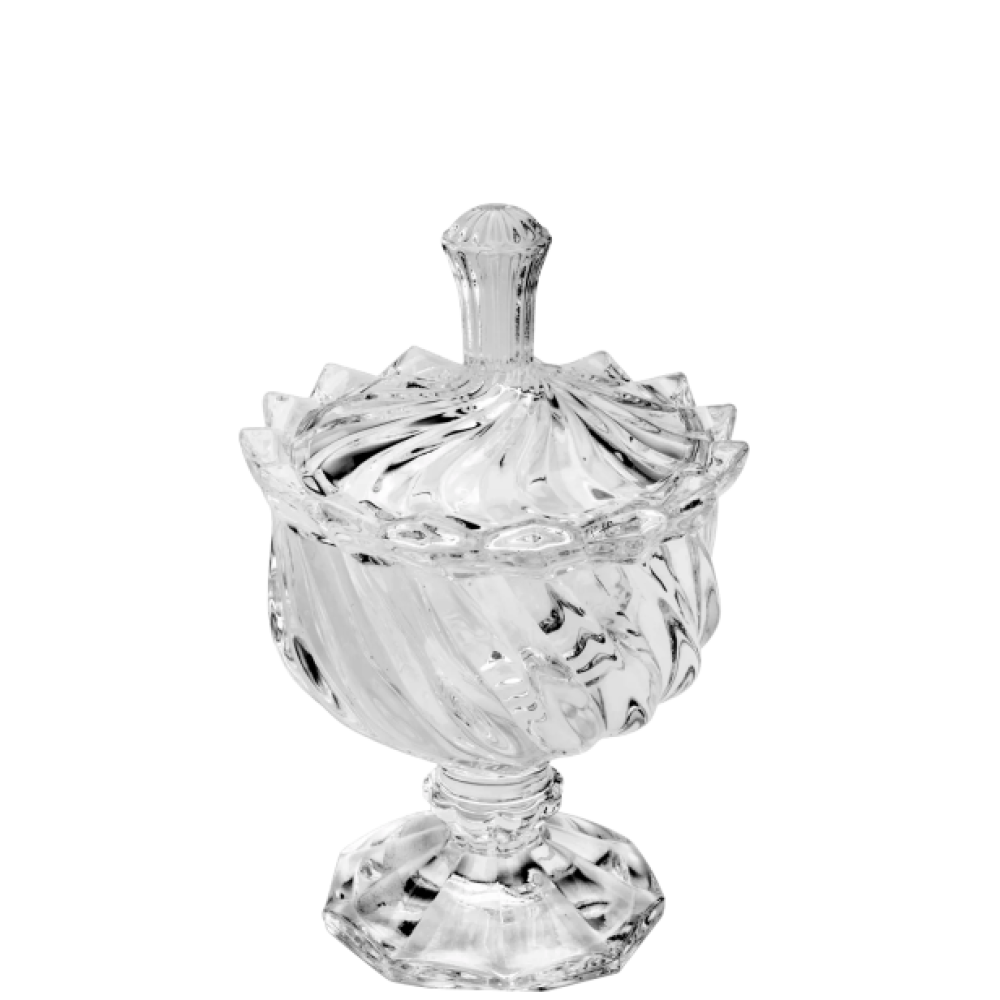 O Potiche de Vidro Espiral com Pé e Tampa é uma peça que une elegância e versatilidade. Com design em espiral e acabamento sofisticado, ele traz um toque de requinte à decoração de qualquer ambiente.