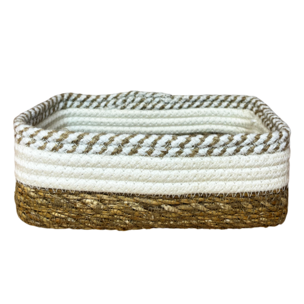 Versátil e resistente, o cesto retangular é confeccionado em algodão, juta e fibra natural, unindo durabilidade e um acabamento rústico que valoriza qualquer ambiente. Ideal para organizar objetos pessoais, roupas ou acessórios, proporcionando praticidade e estilo.