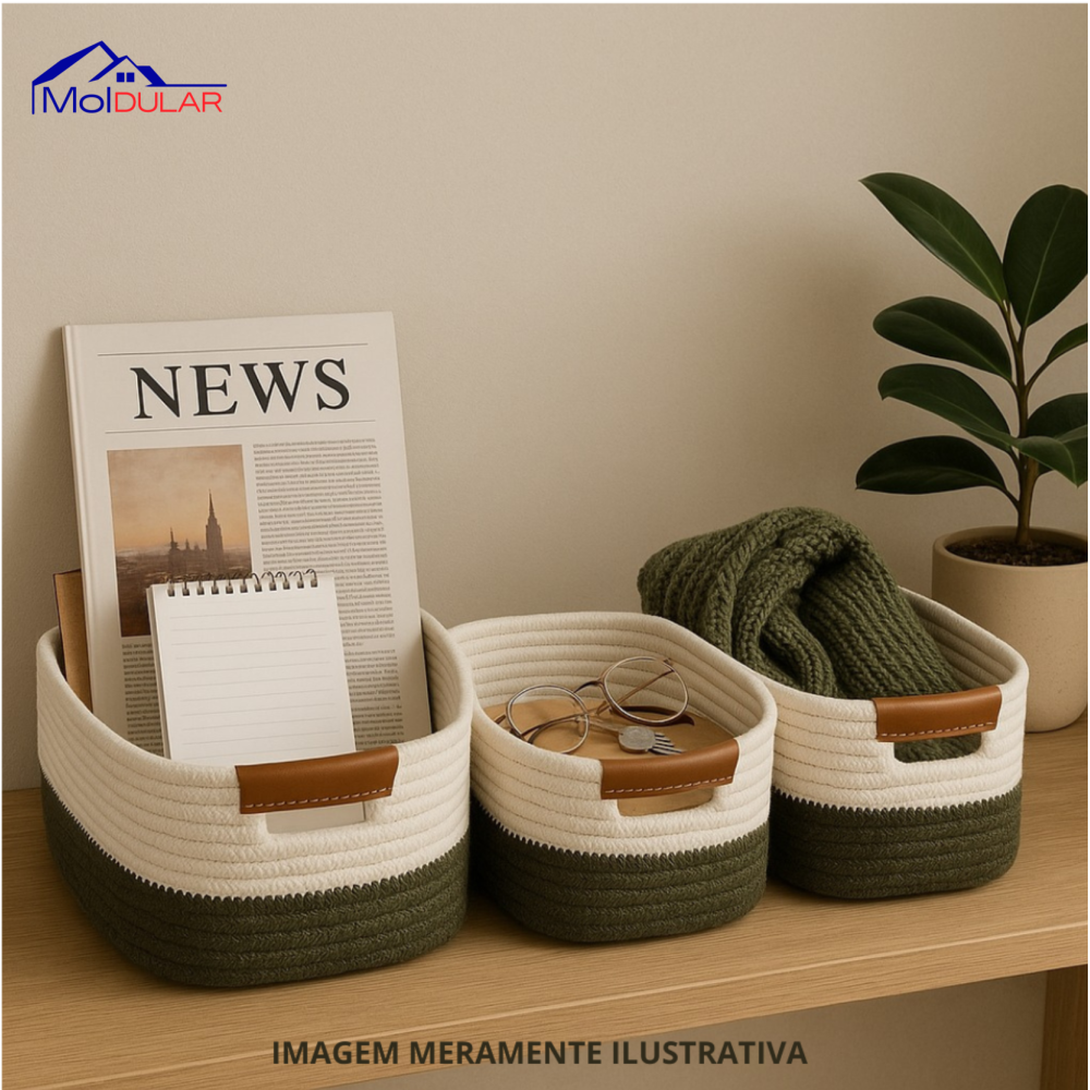 Sugestão: ao adquirir também os produtos 183735 e 183738, é possível formar um kit completo de cestos retangulares com alça de couro em diferentes tamanhos.