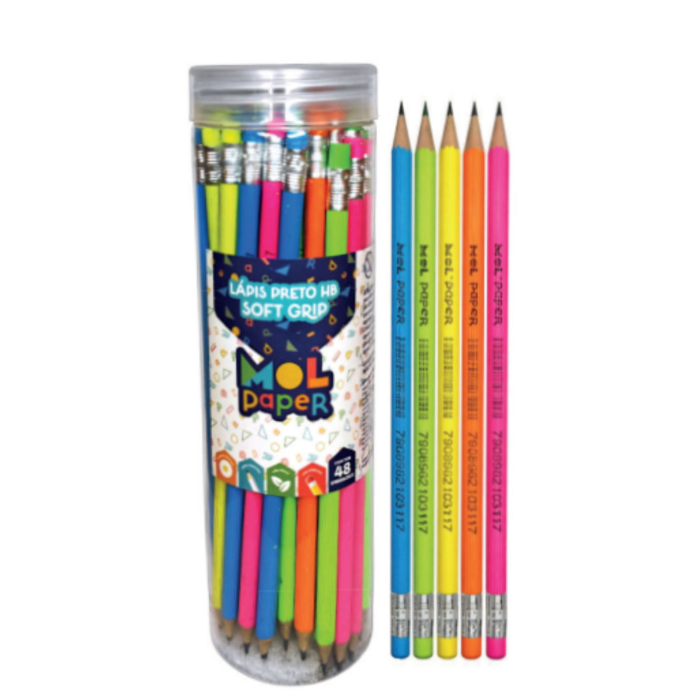 O Lápis Preto Soft Grip com Borracha (Pote com 48 unidades) é ideal para quem busca conforto e praticidade no dia a dia. Seu revestimento emborrachado (soft grip) proporciona uma pegada mais firme e confortável, reduzindo o cansaço durante a escrita. A borracha acoplada facilita correções rápidas, tornando o produto perfeito para escolas, escritórios e uso coletivo.