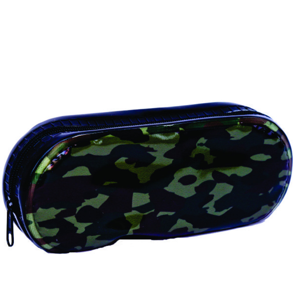 Estojo redondo com estampa camuflada, ideal para organizar lápis, canetas, borrachas e outros acessórios escolares. Produzido em material resistente, oferece praticidade e durabilidade no uso diário, com fechamento em zíper que mantém os itens seguros.