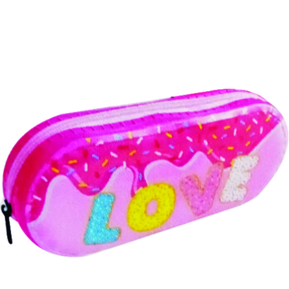 Estojo redondo com estampa temática Love Doce, ideal para organizar lápis, canetas, borrachas e outros acessórios escolares. Produzido em material resistente, proporciona praticidade e durabilidade no uso diário, com fechamento em zíper que mantém os itens seguros.