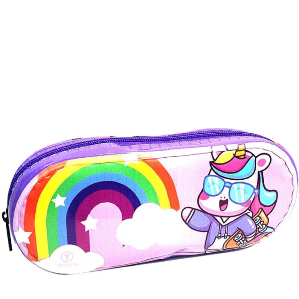 Estojo redondo com estampa temática de unicórnio, ideal para organizar lápis, canetas, borrachas e outros acessórios escolares. Produzido em material resistente, oferece praticidade e durabilidade no uso diário, com fechamento em zíper que mantém os itens seguros.
