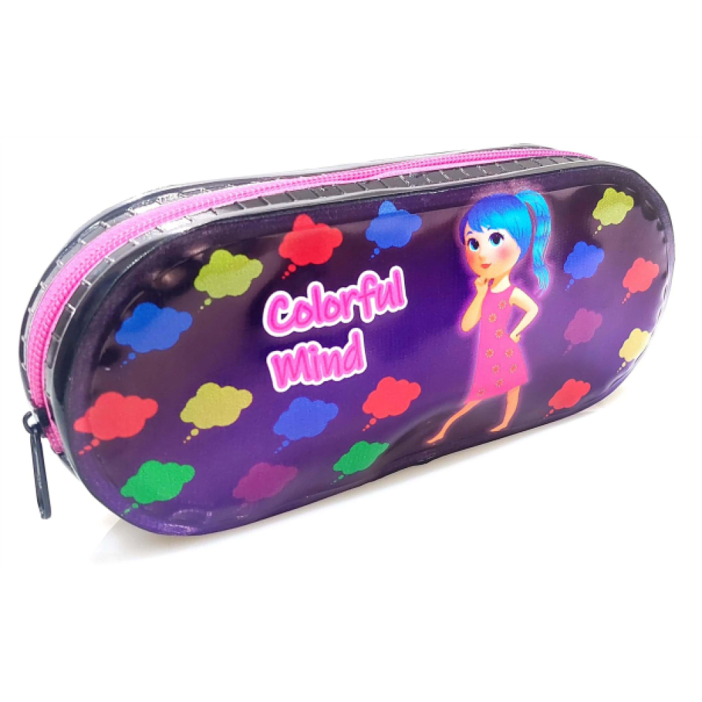 Estojo redondo com estampa temática Color Full Mind, ideal para organizar lápis, canetas, borrachas e outros acessórios escolares. Produzido em material resistente, proporciona praticidade e durabilidade no uso diário, com fechamento em zíper que mantém os itens seguros.