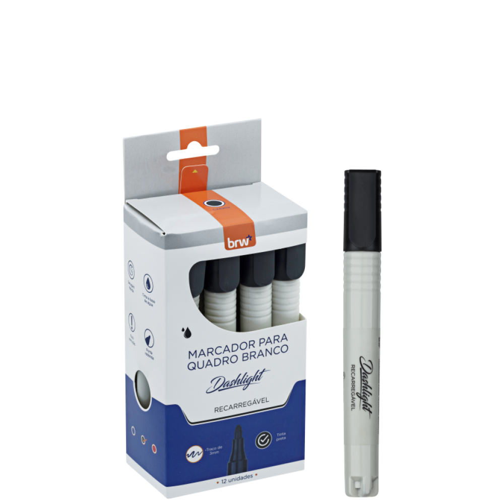 O Marcador para Quadro Branco Recarregável é ideal para uso em salas de aula, escritórios e apresentações. Com tinta preta de alta visibilidade, permite escrita nítida e fácil de apagar, garantindo praticidade e economia. O marcador é recarregável, proporcionando durabilidade prolongada, enquanto o pacote com 12 unidades oferece ótimo custo-benefício e praticidade para uso contínuo.