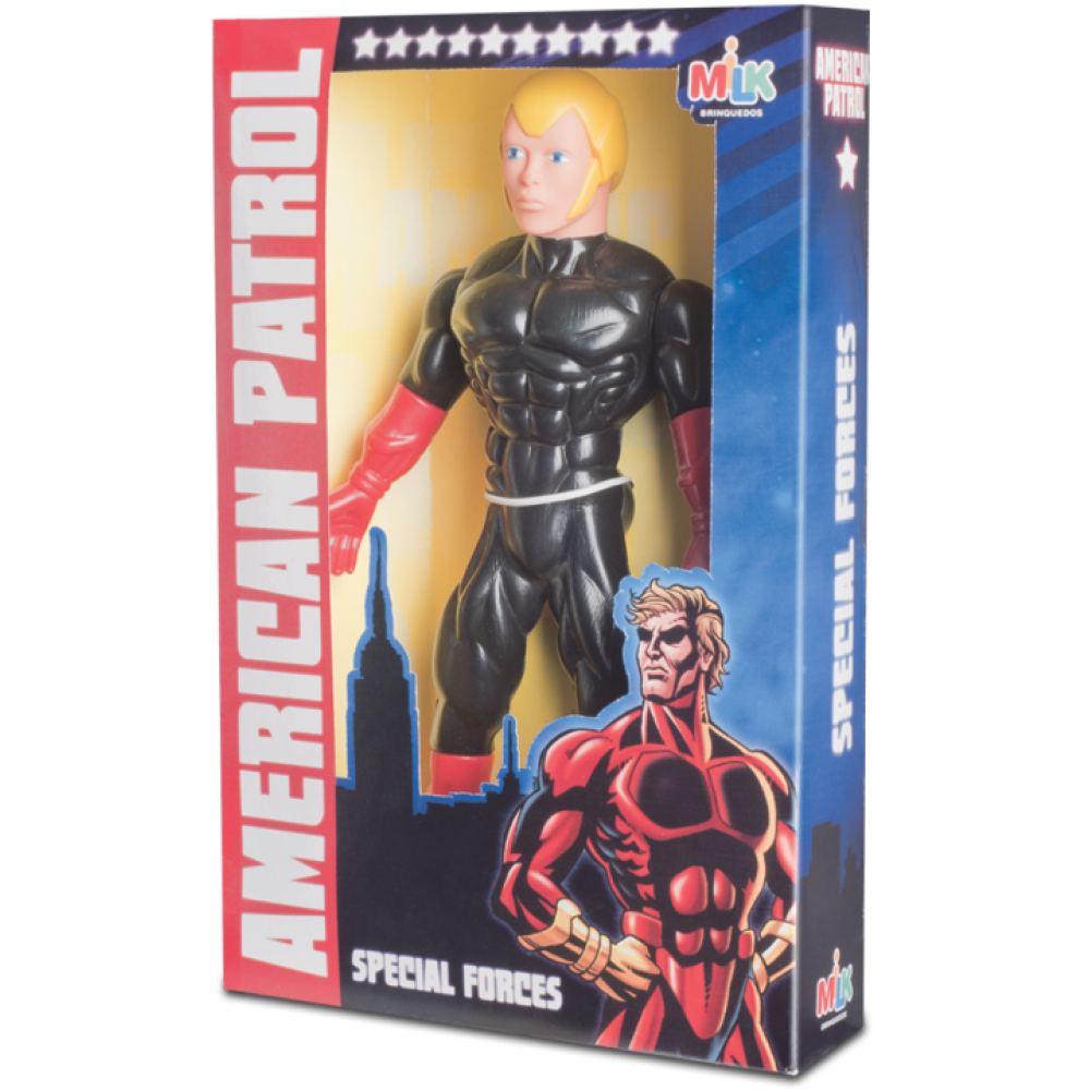 Pronto para a ação! O Boneco American Patrol mede 33,5 cm e vem com uniforme detalhado, perfeito para aventuras cheias de coragem e imaginação.