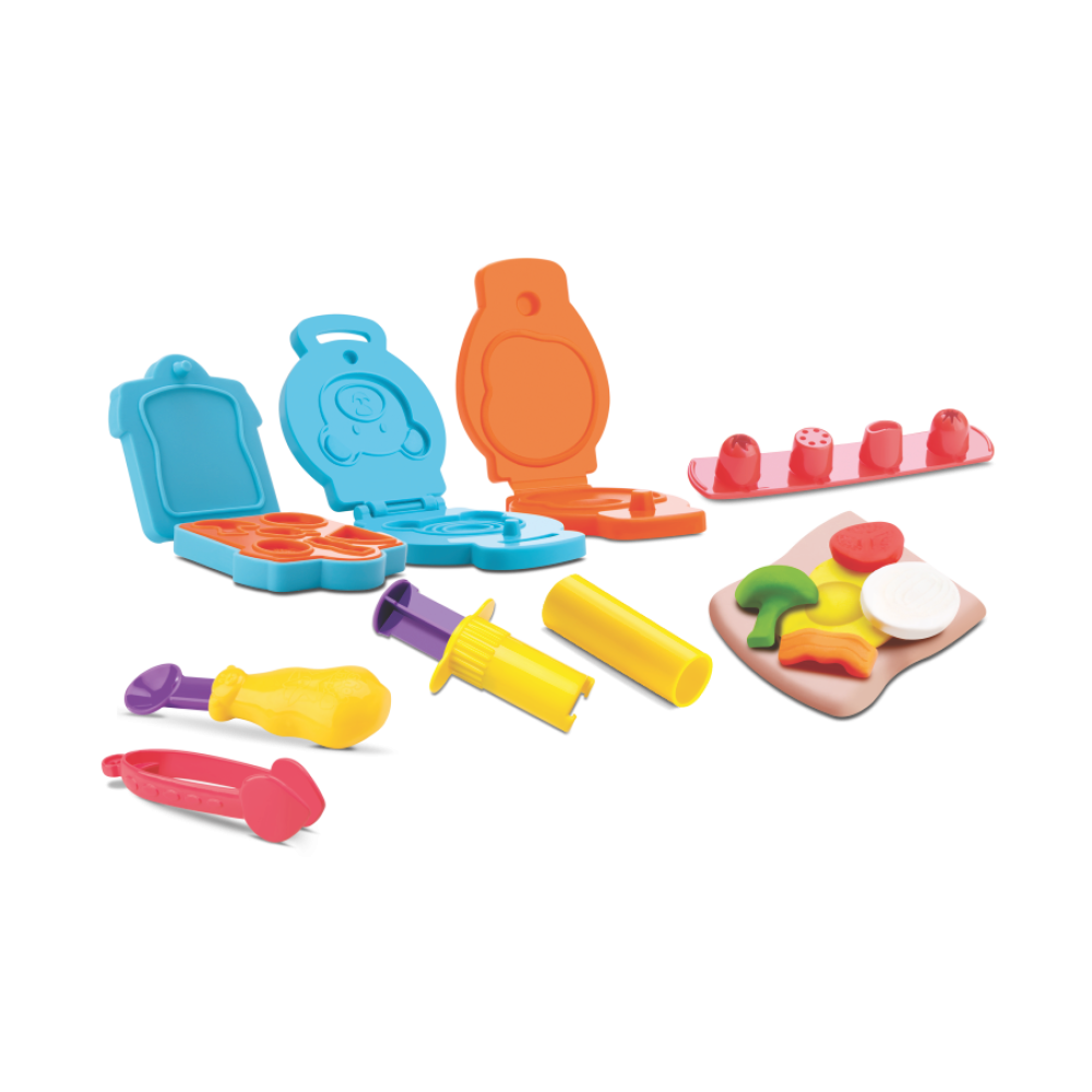 Acompanha massinhas coloridas e acessórios temáticos de café da manhã (como formas, utensílios e moldes).