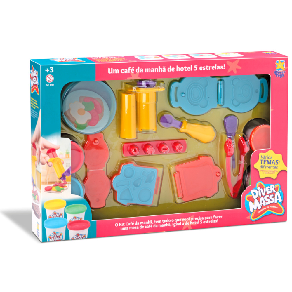 O Diver Massa Café da Manhã é um kit criativo que permite às crianças reproduzirem com massinha um café da manhã completo e divertido. Com acessórios temáticos e cores vibrantes, o conjunto estimula a imaginação enquanto a criança molda, cria e brinca.