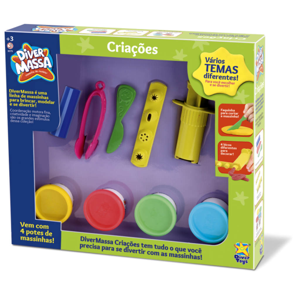 O Diver Massa Criações é um kit completo para crianças que adoram modelar, inventar e criar. Com massinhas coloridas e diversos acessórios, o conjunto oferece tudo o que é necessário para estimular a imaginação e desenvolver habilidades motoras.