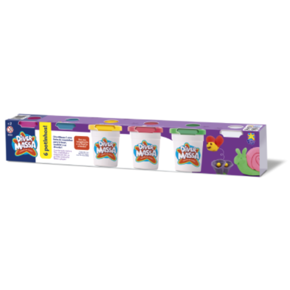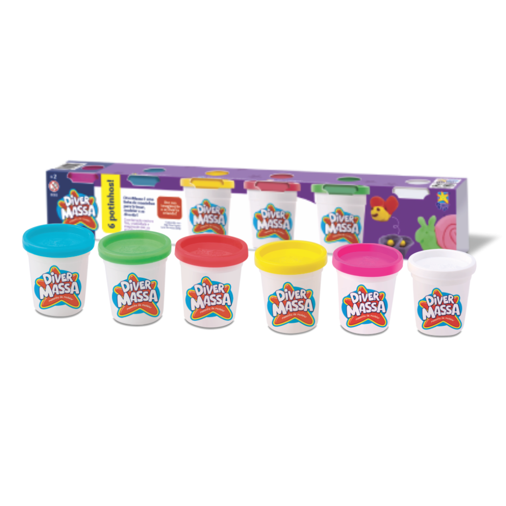 O Diver Massa Kit com 6 potes oferece ainda mais variedade de cores para estimular a criatividade das crianças. Cada pote contém 50g de massinha macia, segura e fácil de modelar.