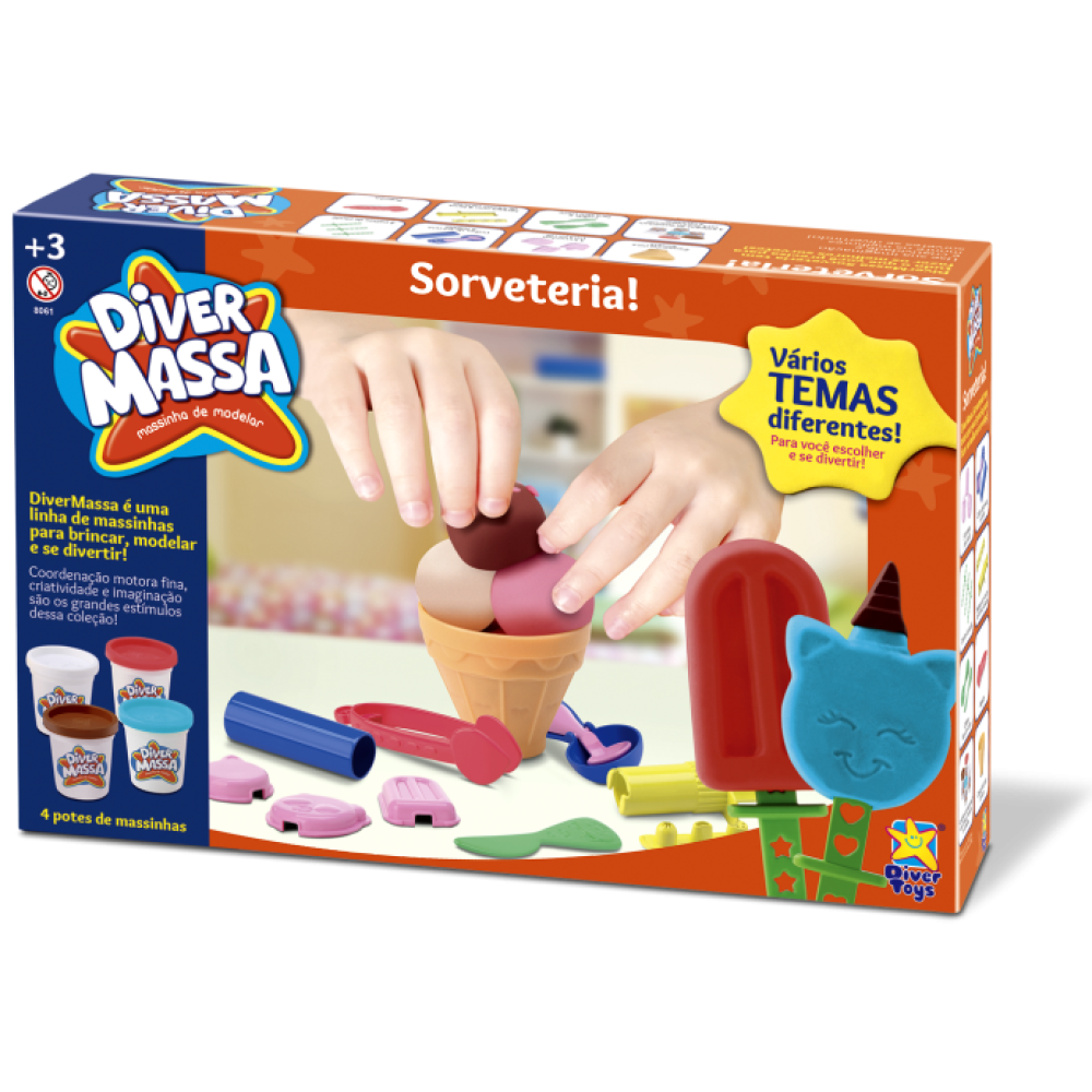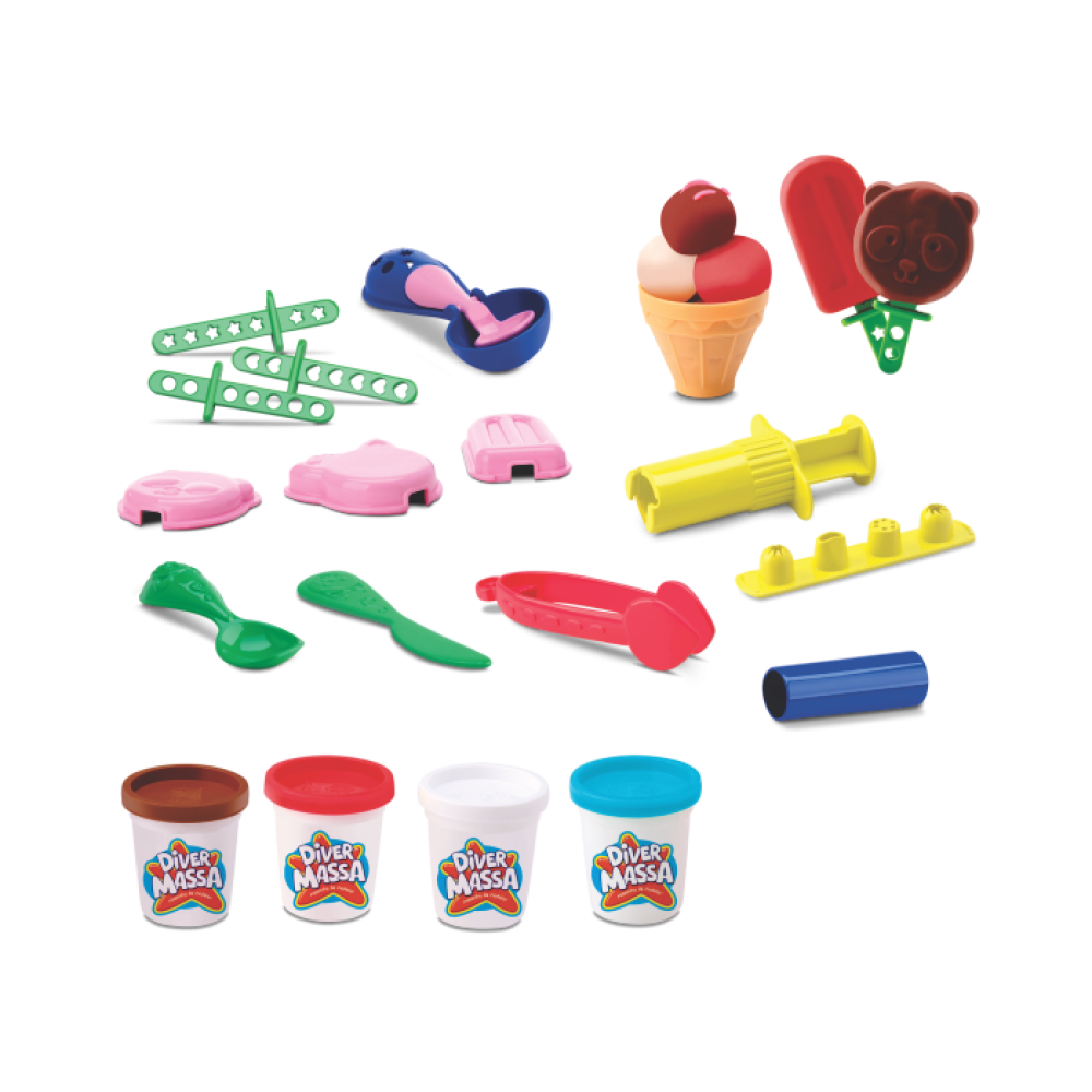 A diversão está garantida com a Diver Massa Sorveteria! Com este kit super completo, as crianças podem soltar a criatividade e montar seus próprios “sorvetes” usando massinha colorida. Acompanha diversos acessórios temáticos, formas e utensílios que deixam a brincadeira ainda mais realista e divertida.