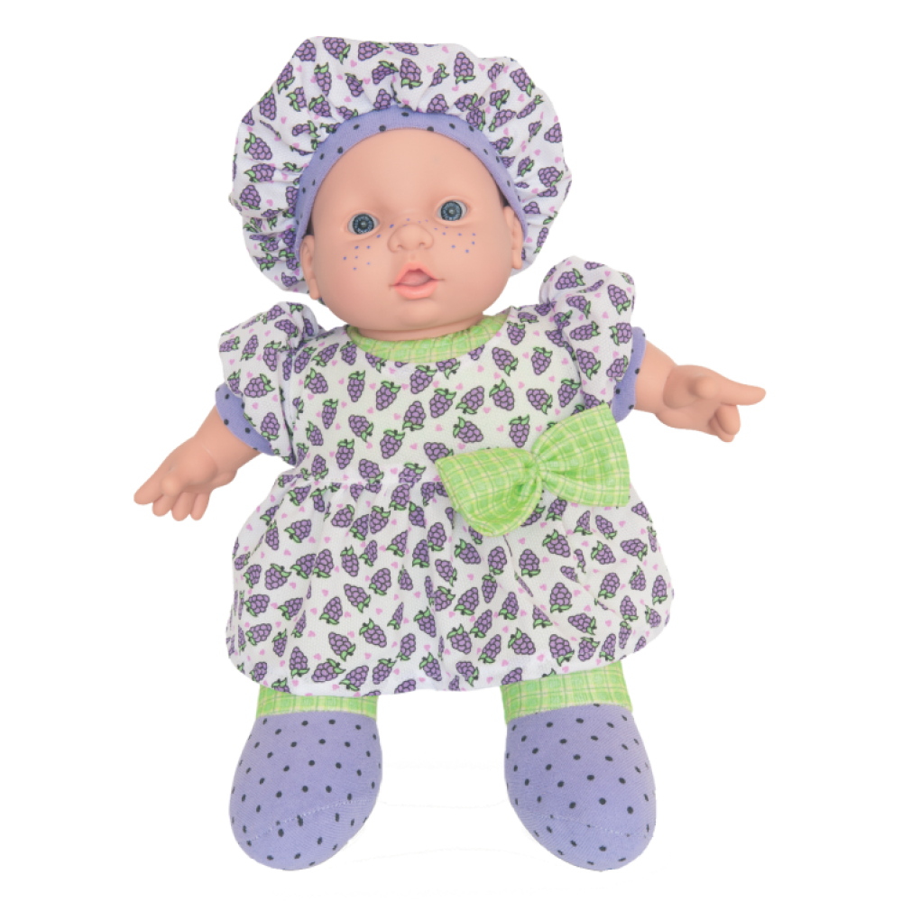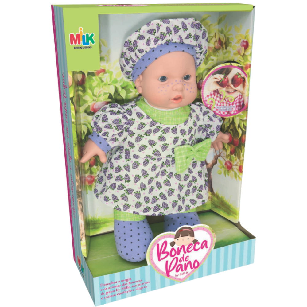 A Boneca de Pano Uva é charmosa e macia, ideal para brincadeiras seguras e criativas. Com 46cm de altura, permite que as crianças criem histórias, abracem e cuidem da boneca, estimulando a imaginação e o faz de conta.