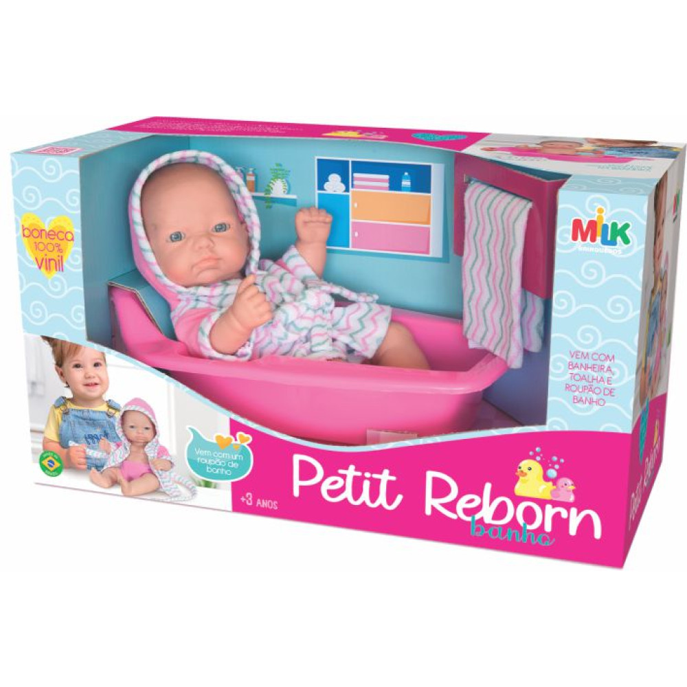 A Boneca Petit Reborn Banho é pura fofura e realismo! Com 33 cm de altura, ela é feita em vinil macio e resistente à água, perfeita para o momento do banho.