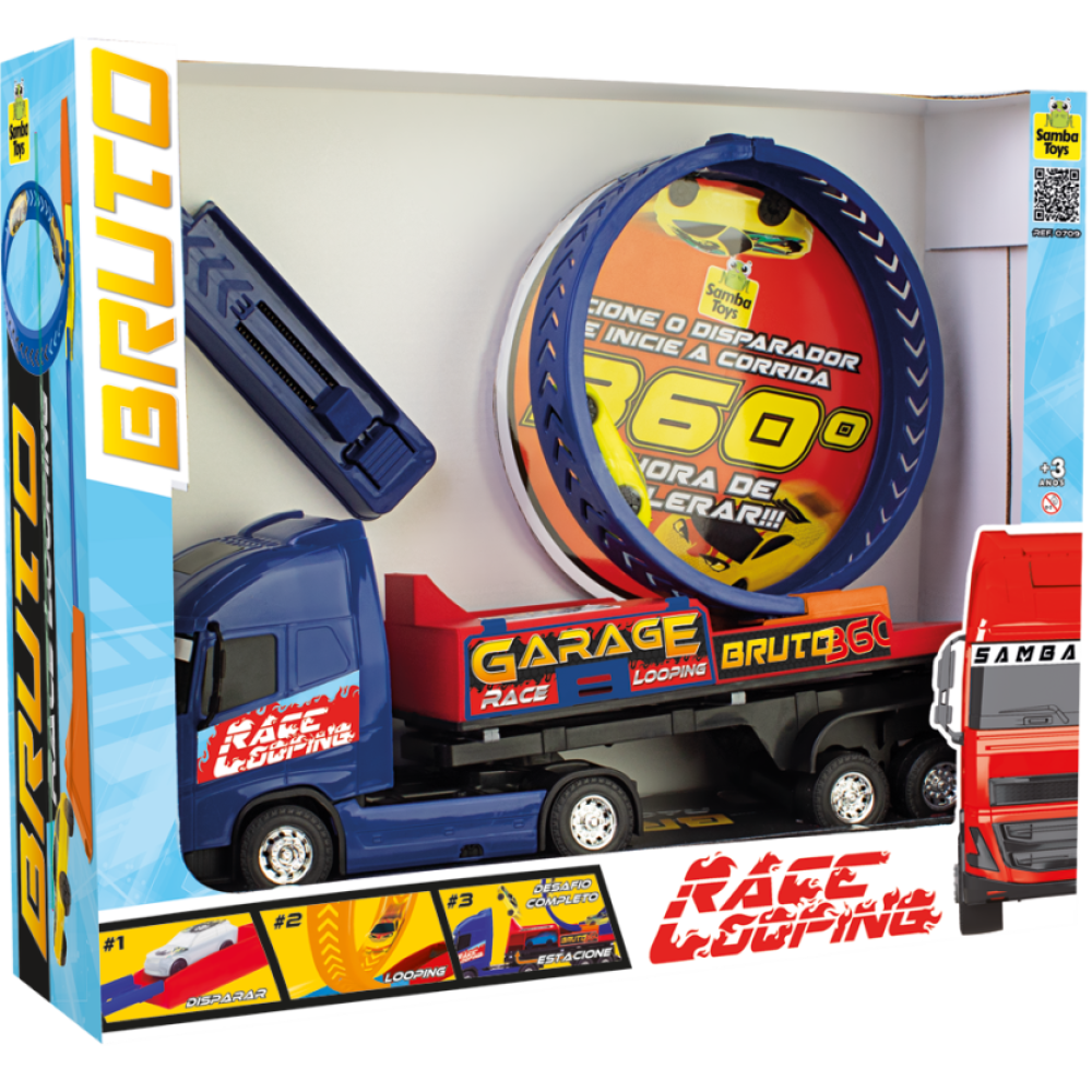 Prepare-se para uma dose extra de adrenalina com o Caminhão Bruto Race Looping! Um super caminhão de 44 cm que transporta um carrinho veloz e uma pista looping para manobras radicais!