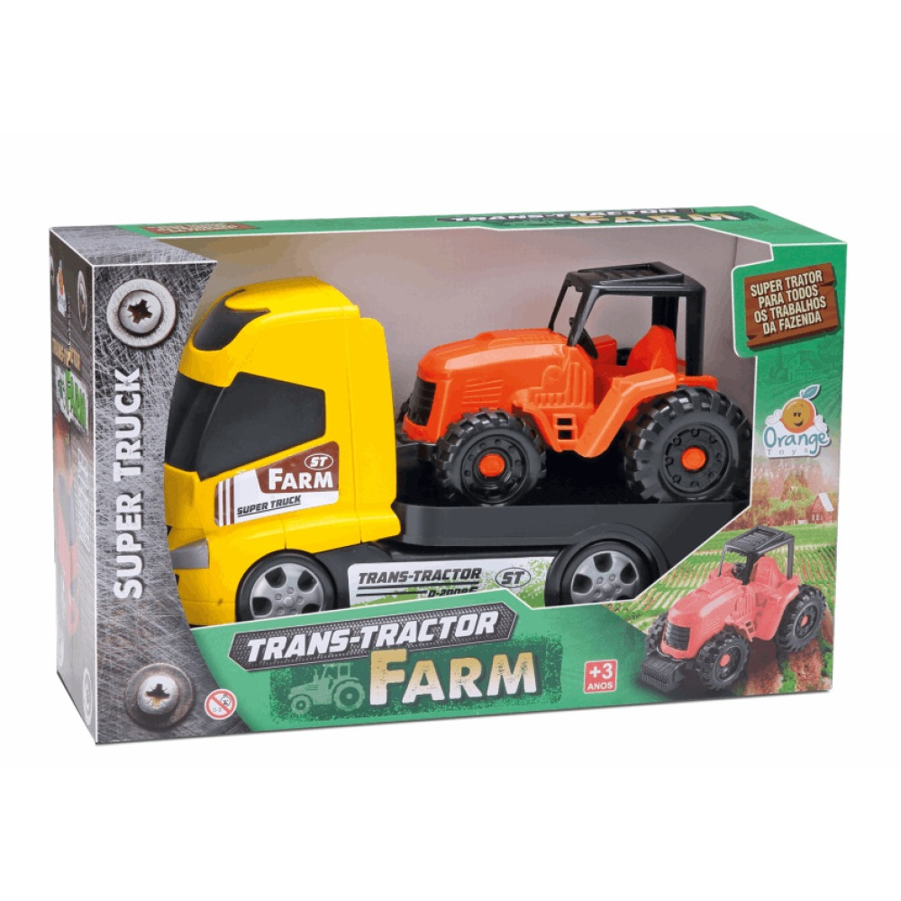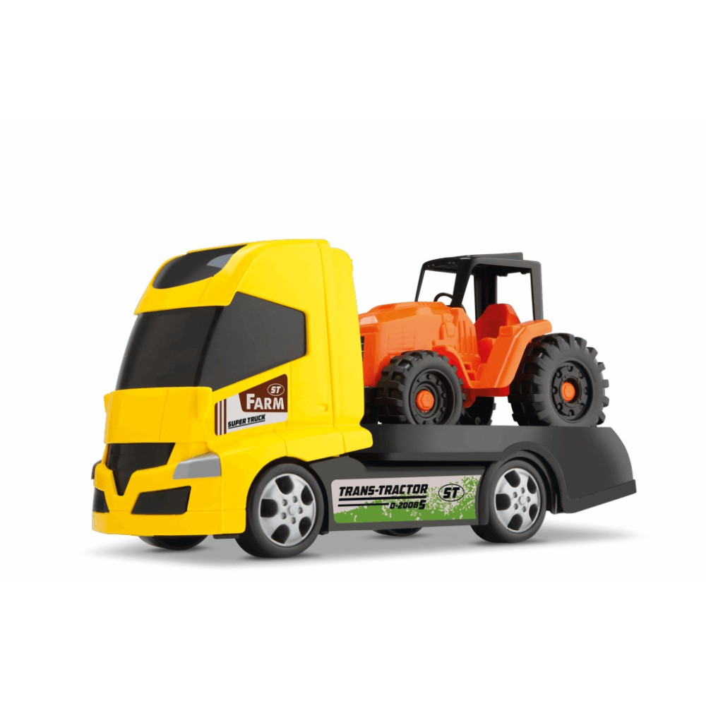 O conjunto inclui caminhão plataforma e trator, permitindo que as crianças transportem e movimentem veículos de construção em suas brincadeiras. Feito em plástico resistente, é seguro e durável para muita imaginação e aventuras.