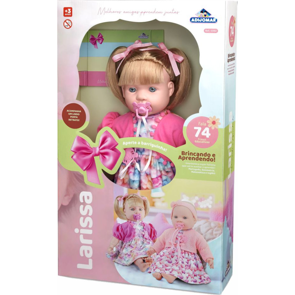 A Boneca Larissa é grande, linda e super falante! Com 60 cm de altura, cabelos macios para pentear e 74 frases diferentes, ela é perfeita para encantar e divertir as crianças com muita interação e carinho.