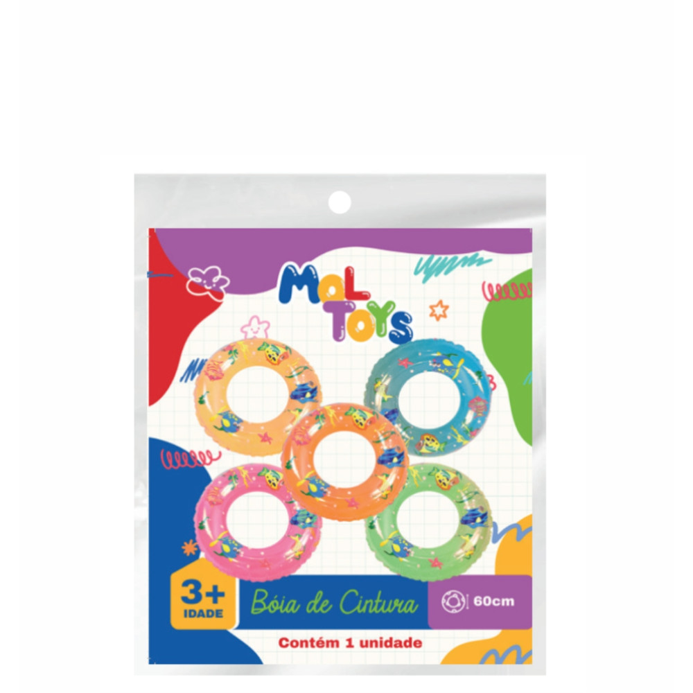 Boia de cintura ideal para momentos de lazer em piscinas e praias. Possui 60 cm de diâmetro, com estampas decoradas e sortidas, trazendo mais diversão e cor para o uso infantil. Produzida em PVC resistente, é leve, prática, fácil de inflar e transportar, garantindo conforto durante a brincadeira.
