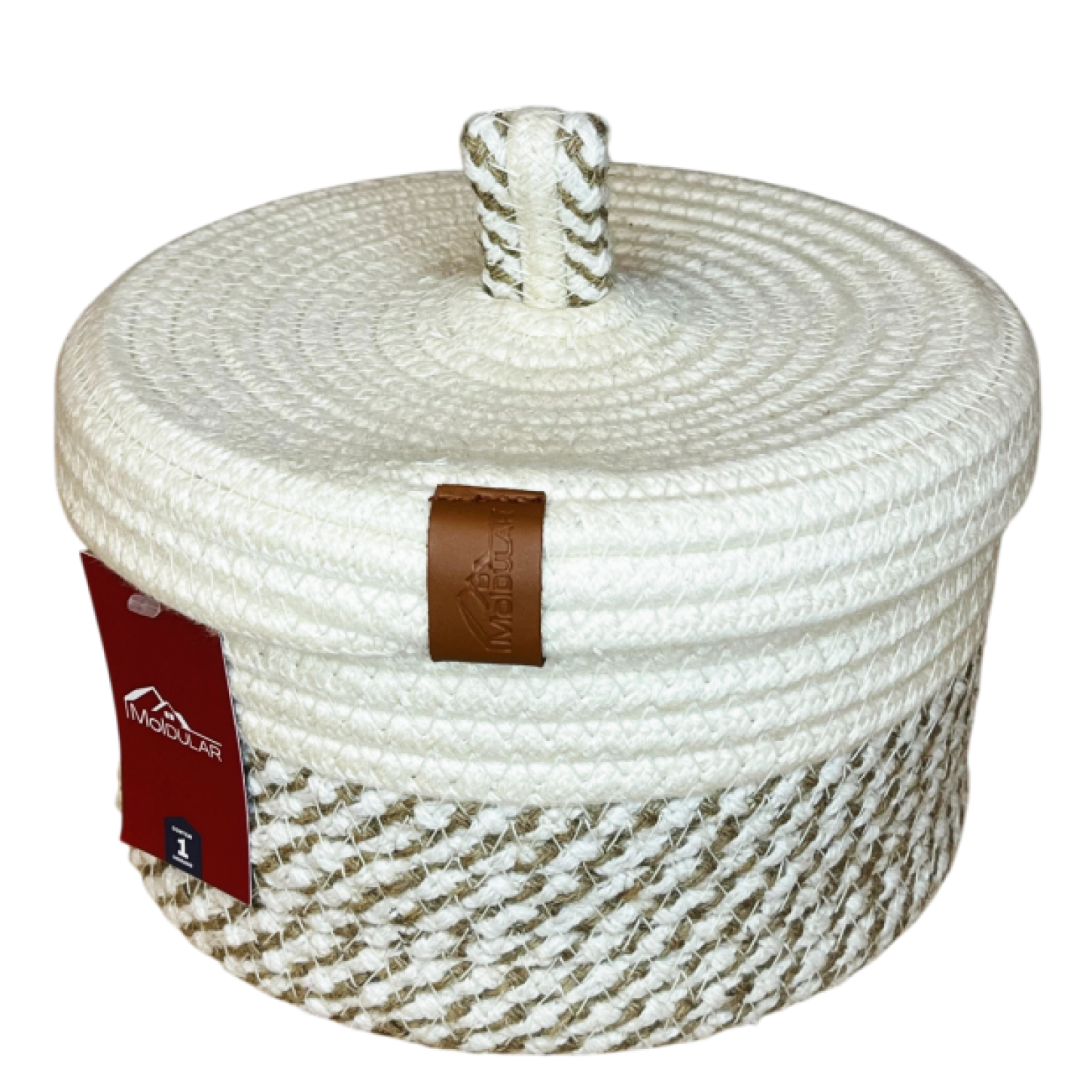 Com design natural e elegante, a caixa organizadora é produzida em algodão e juta, unindo resistência e sofisticação. Seu formato redondo com tampa garante proteção e praticidade no dia a dia, além de ser uma peça que agrega charme à decoração de qualquer ambiente.