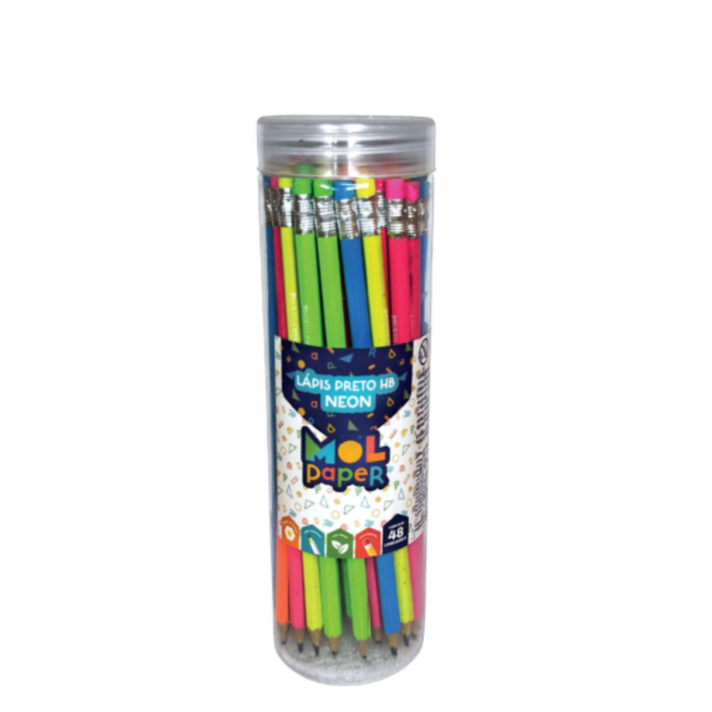 O Lápis Preto Neon com Borracha (Pote com 48 unidades) é a escolha ideal para escolas, escritórios e uso cotidiano. Com design moderno em cores neon e borracha acoplada, oferece praticidade na hora de escrever, corrigir e destacar anotações. A embalagem em pote facilita o armazenamento e distribuição em ambientes de grande fluxo.